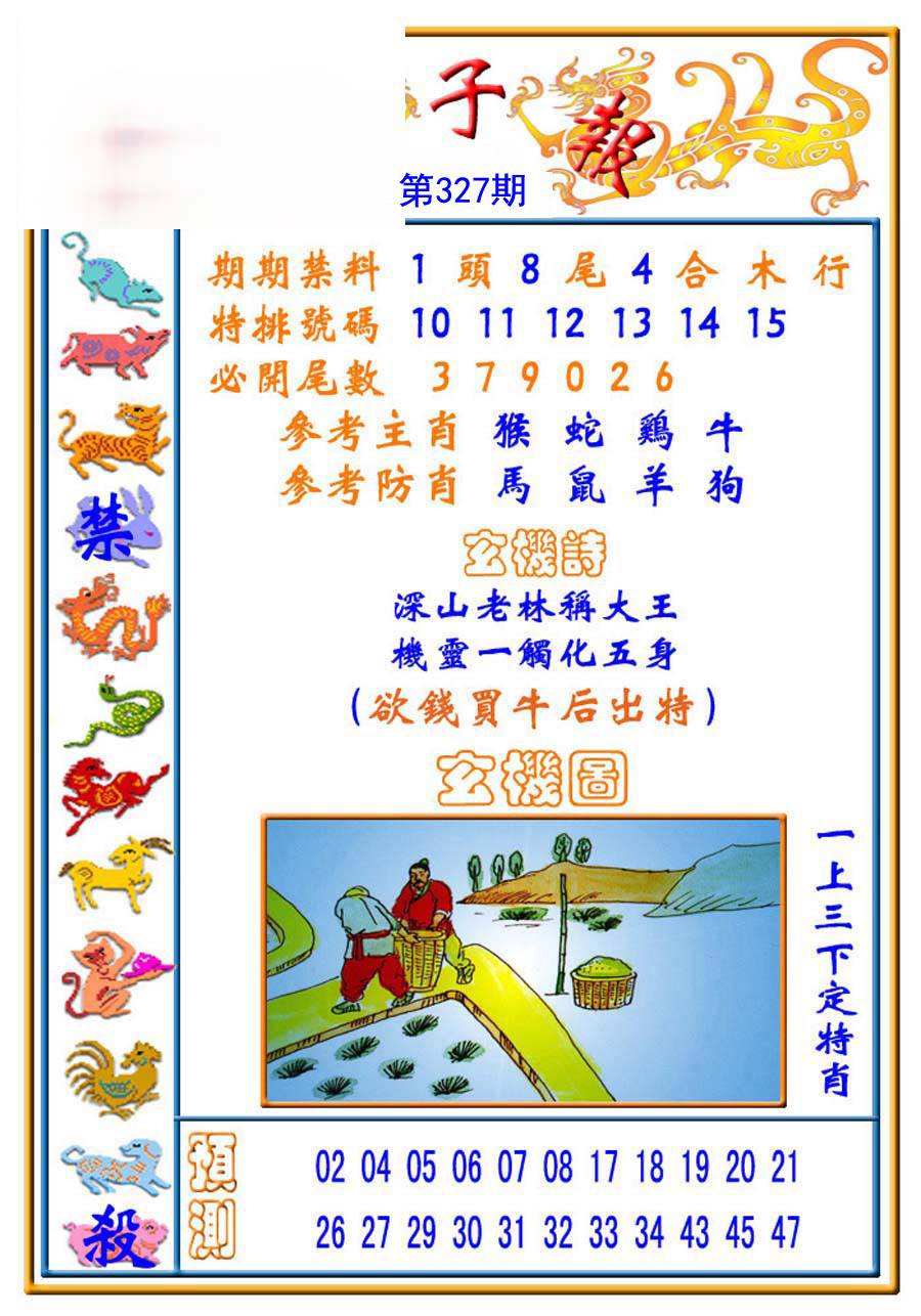 | 327期;【马狗羊鼠牛猪猴蛇龙】开:?00 |