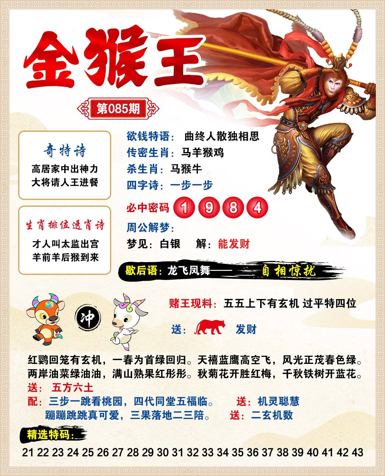 084期金牌⑥肖【牛猪猴狗龙马】开:鼠07 |