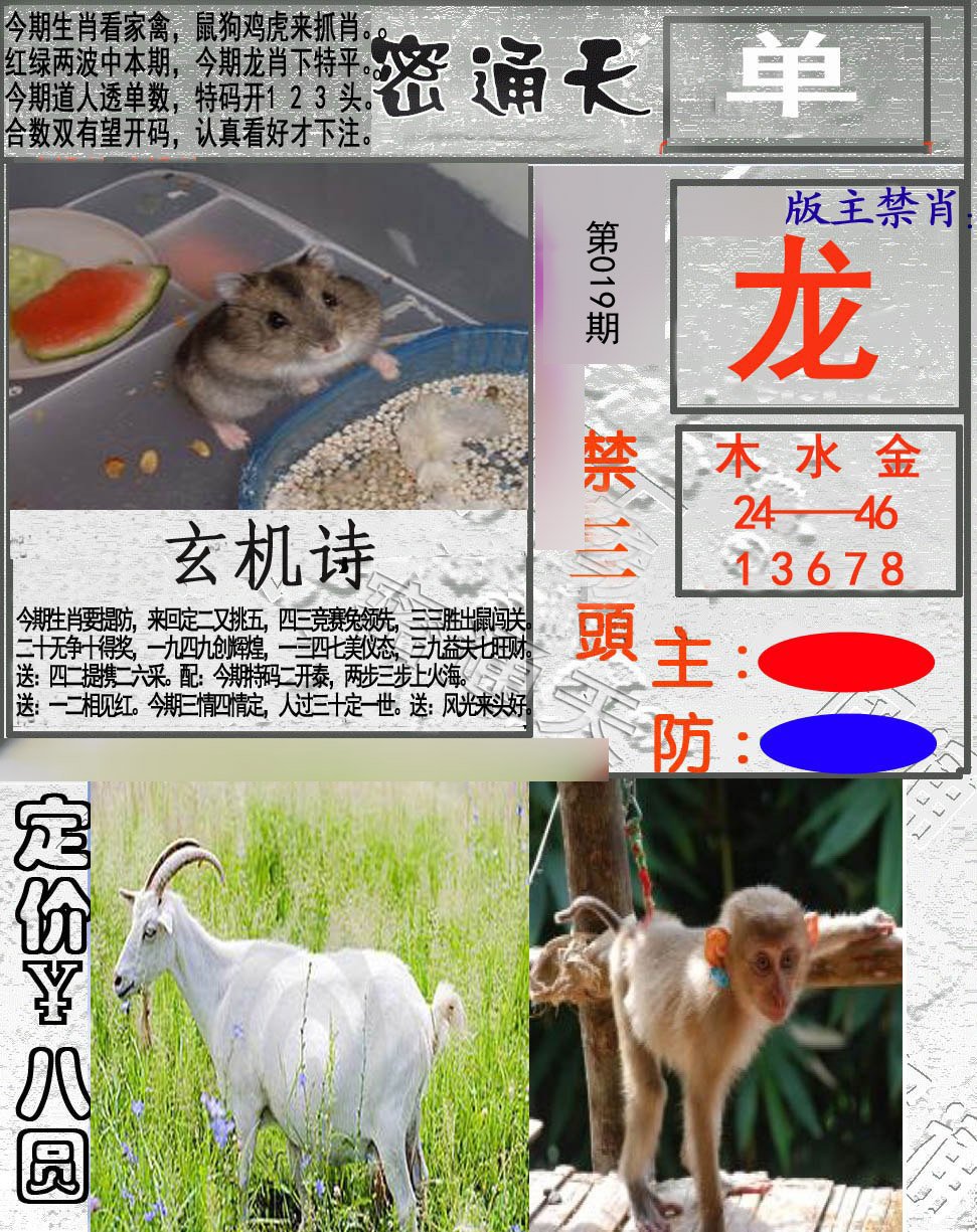 | 012期;【鼠兔虎鸡羊猴牛马蛇】开:猴46 |
