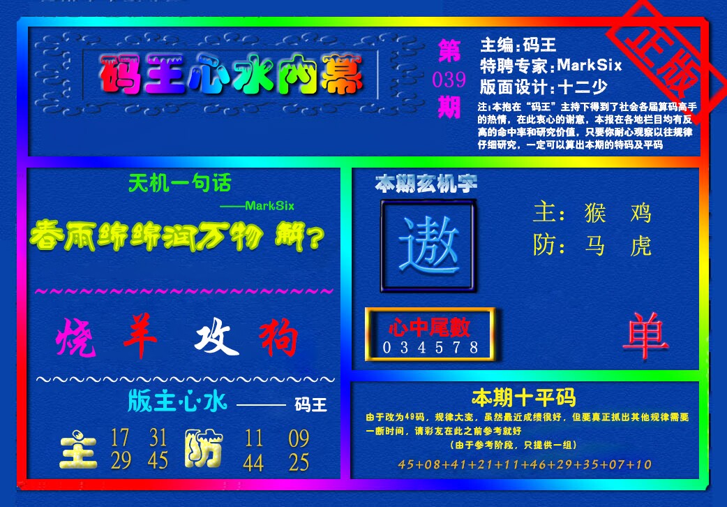 039期金牌③肖【鸡羊鼠】开:0 |