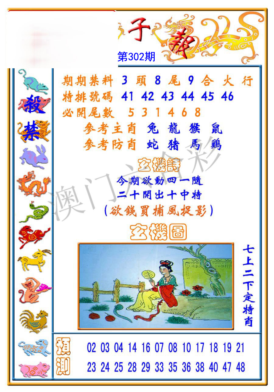 | 302期;绝杀【猪肖】绝杀【3尾】开:?00 |