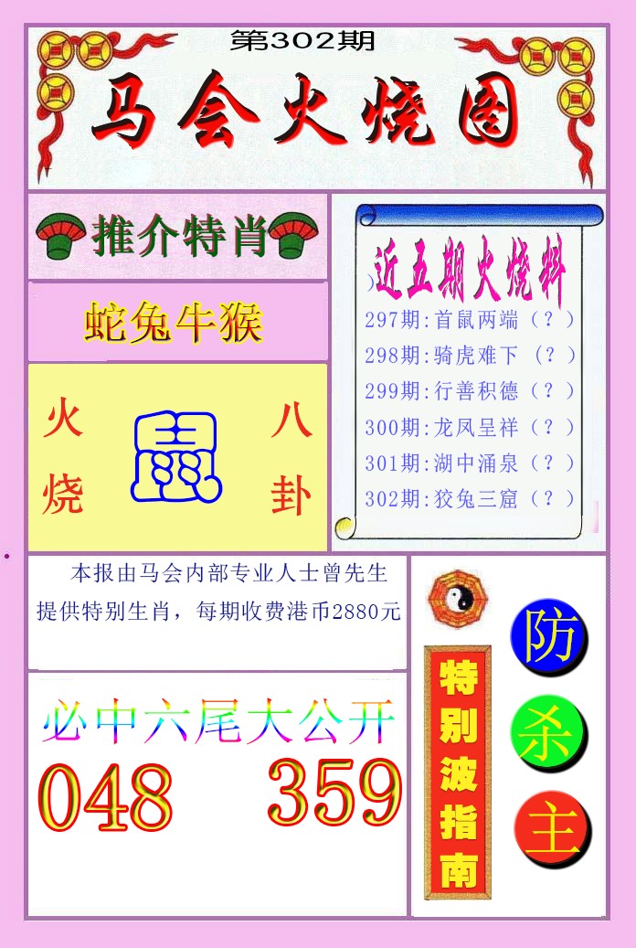 296期开:鼠30 今期买蛇狗输尽光, 看中3头4尾全不买 |